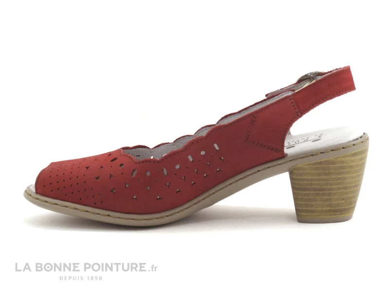 Ce nu-pied Femme est en cuir velouté rouge foncé / bordeaux, orné de petites perforations fantaisie sur le devant.