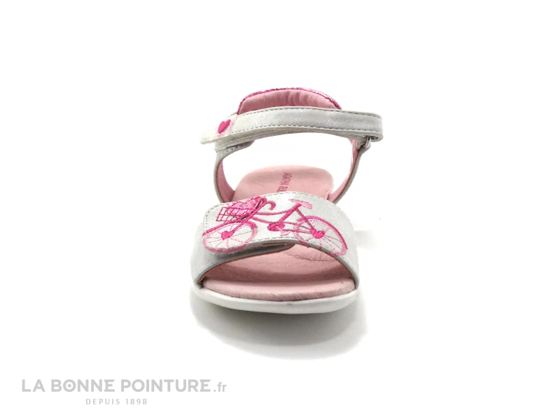 Cette sandale d’été est gris métallisé, avec un empiècement rose métal à l’arrière, un un vélo (rose aussi !) brodé sur le devant.