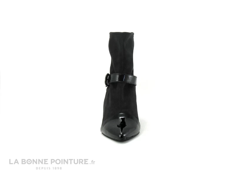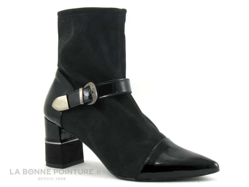 Cette bottine à talon haut est noir verni avec une partie en stretch, habillée d’une bride à boucle réglable sur 3 positions.