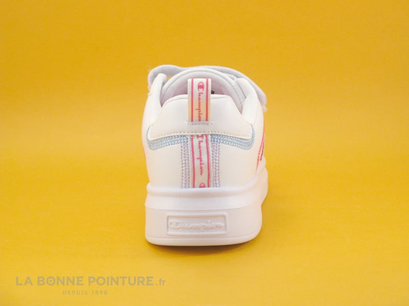 Ces baskets basses fille Champion sont en simili cuir blanc, avec un peu de rose et de bleu.