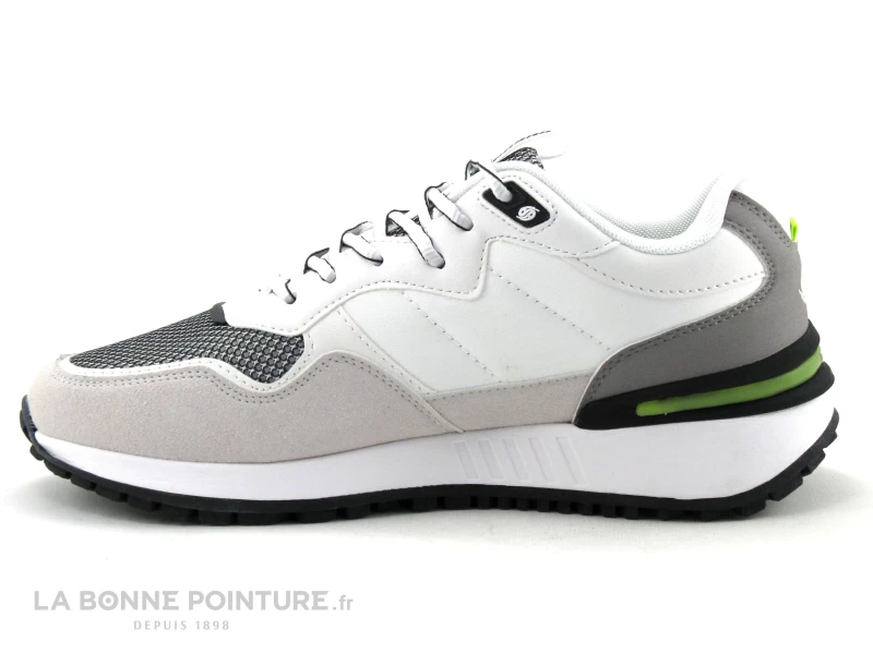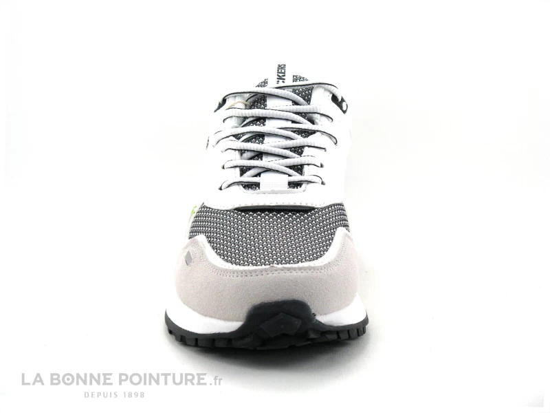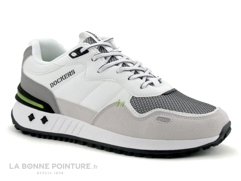 Ces sneakers mode Homme Dockers by Gerli mélangent du blanc, du gris et du beige taupe, avec un peu de noir et de vert lime à l’arrière.