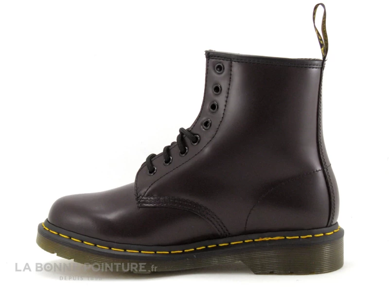 Vous fermerez vos boots bordeaux Dr Martens 1460 avec un lacet arrondi noir, traversant 8 œillets noirs aussi.