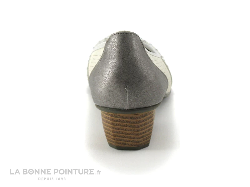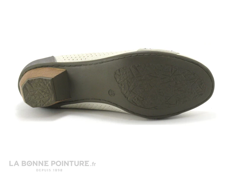 Cette chaussure femme est en simili cuir beige, avec un empiècement bronze à l’arrière.