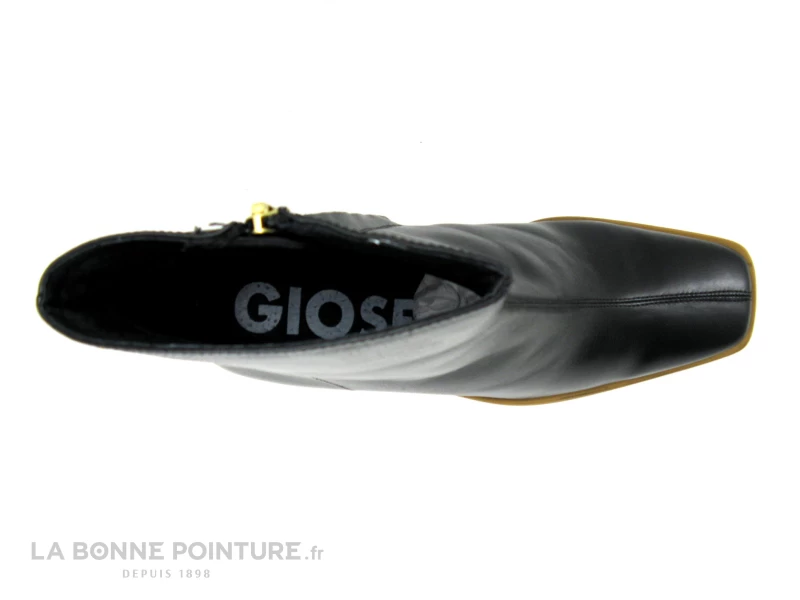 Cette bottine Femme Gioseppo est en cuir lisse noir, avec bout carré et couture apparente sur le dessus.