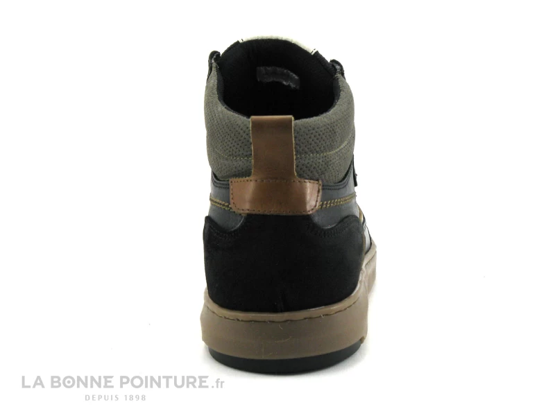 Cette basket montante Homme est en cuir noir, avec le tour de cheville en cuir velours gris et des petites touches de marron camel.