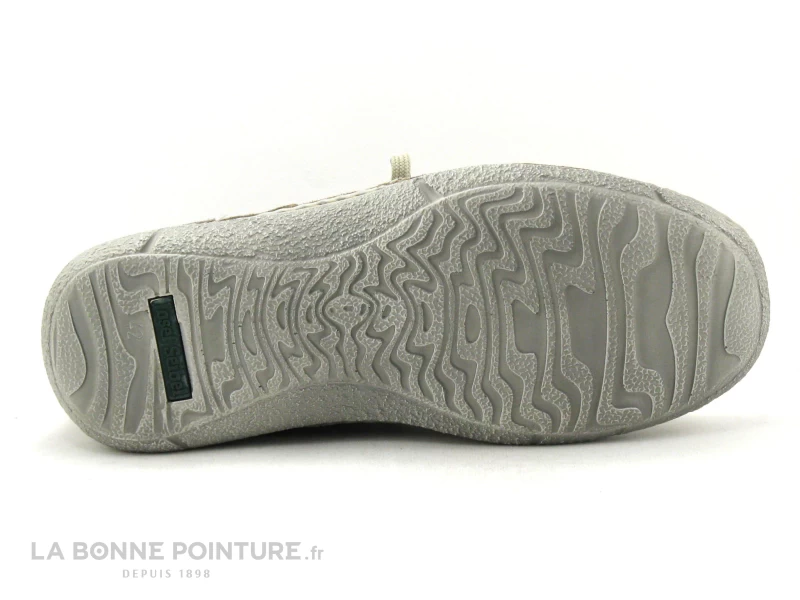 Cette chaussure Homme grande largeur est en cuir velouté beige, avec des bandes bleu marine et marron sur les côtés.