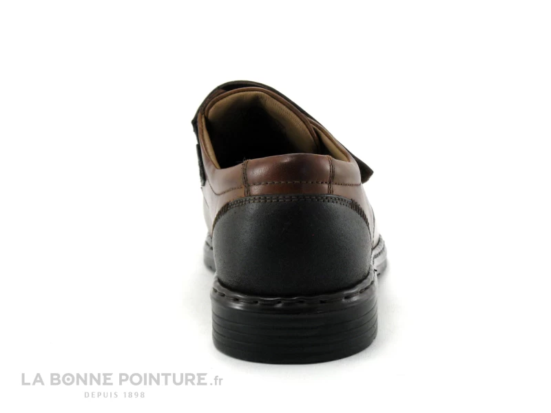Cette chaussure Homme grande largeur avec scratch Josef Seibel 42802 est en cuir marron clair nuancé, avec le contrefort marron foncé à l’arrière.