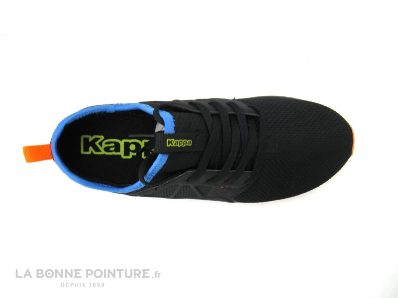 Cette belle basket unisex Kappa est en tissu maille et matières synthétiques, noire avec le tour de cheville bleu turquoise.