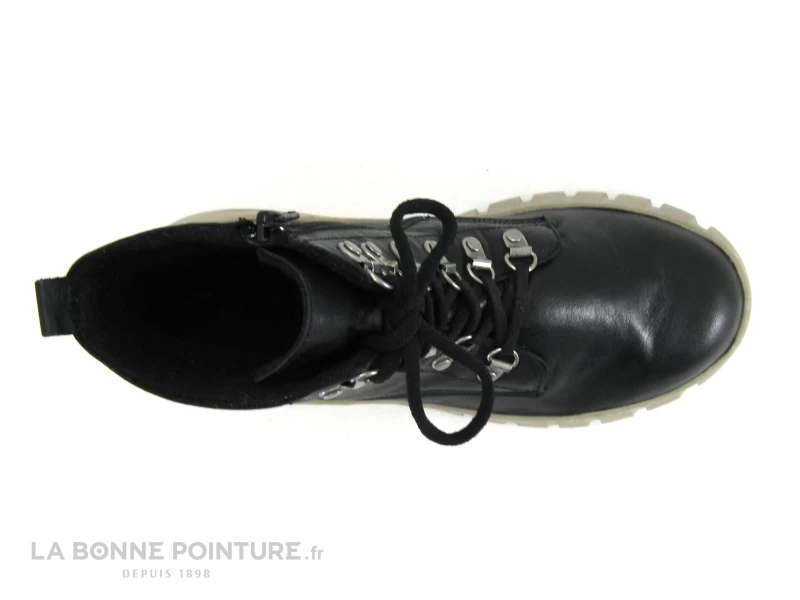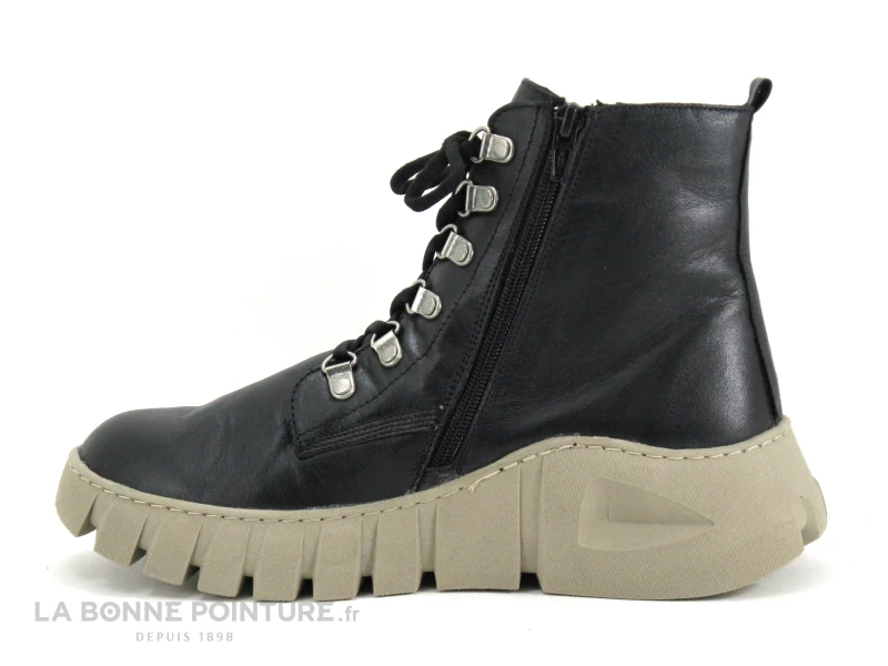 Cette chaussure montante plateforme Femme Karyoka Imane est en cuir souple noir, avec une étoile à trois branches sur le côté externe.