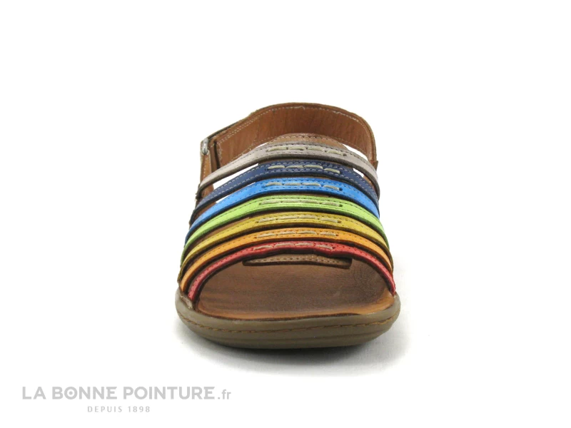 Ce nu-pieds mode Femme Karyola est tout en cuir, avec des lanières de toutes les couleurs fixées sur une large bande de cuir marron camel.