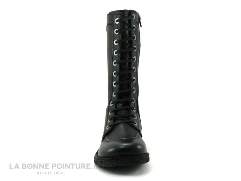 Le lacet noir se faufile à travers douze oeillets métalliques gravés Kickers, afin de régler la botte noire Kickers à votre morphologie.