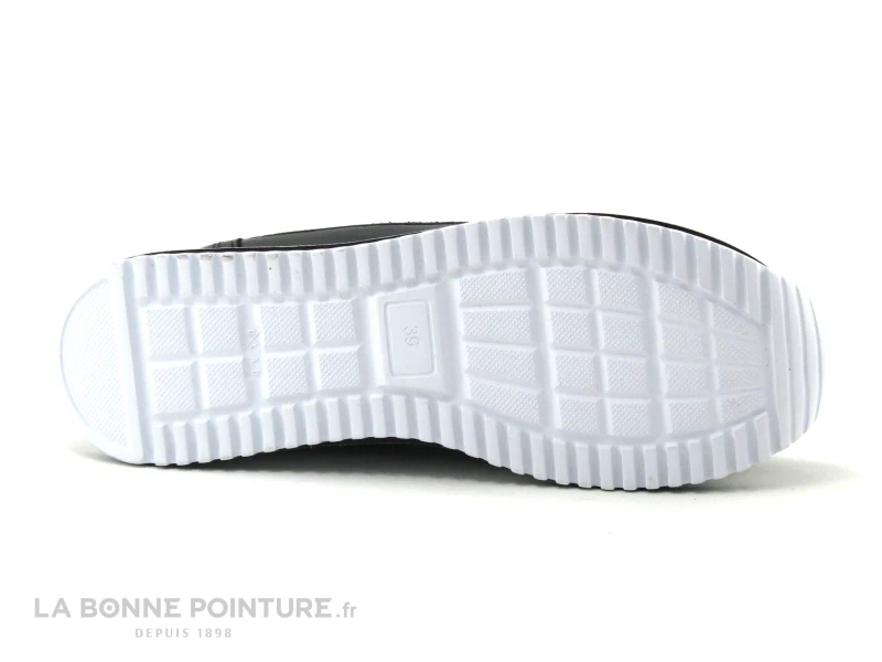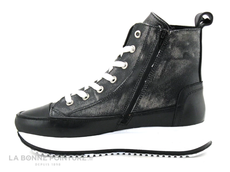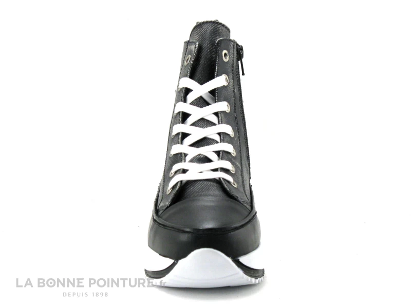 Cette chaussure montante Femme à plateforme mélange des parties aspect jean grisé/nuancé et noires, pour un effet mode et vraiment original.