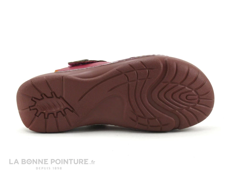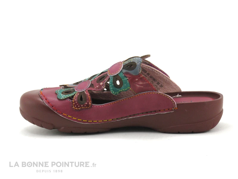 Ce sabot souple Femme Laura Vita est en cuir rose foncé (violine), avec des fleurs multicolores.