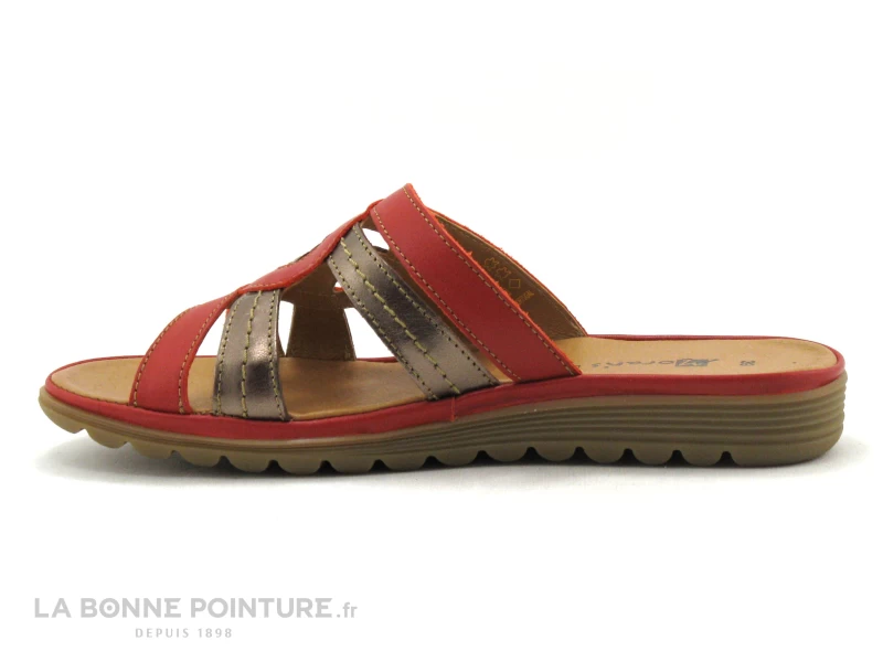 Cette chaussure ouverte Femme combine un cuir rouge et un cuir bronze métallisé.