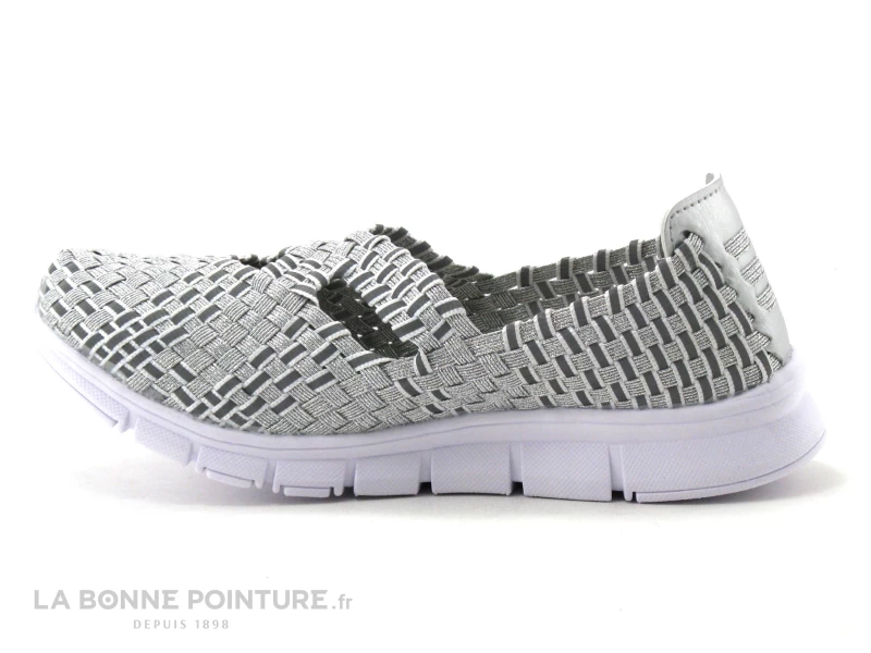 Cette basket slip-on Femme est en élastique gris argent avec des bandes réfléchissantes qui donnent de la brillance selon la luminosité. 2 brides se croisent sur le coup de pied pour un meilleur maintien.