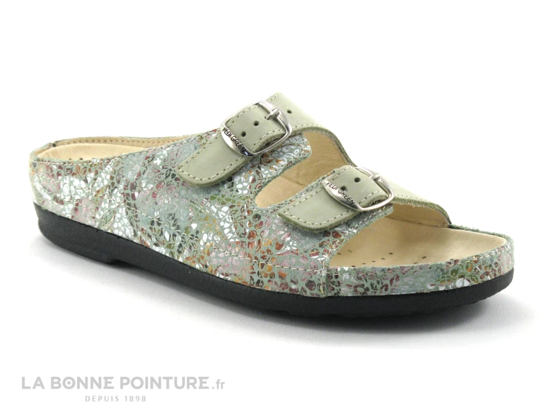 Cette mule confort Femme Pedi Girl Well mélange un cuir velouté vert amande (kaki très clair) et un cuir imprimé floral, avec une petite touche argentée.