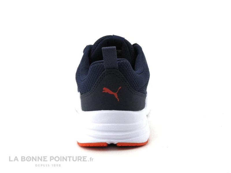 Cette basket bleu marine pour le sport ou pour le quotidien est en textile respirant, avec un élastique bleu sur l’avant marqué Puma en orange foncé.