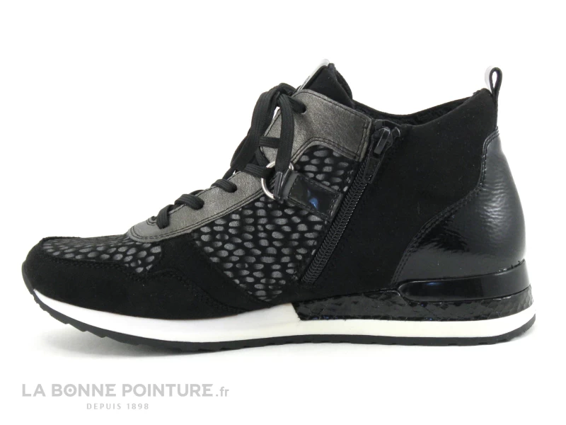 Cette basket montante Femme Remonte R2574-03 mélange des parties noires veloutées et vernies avec un imprimé à pois gris sur fond noir.