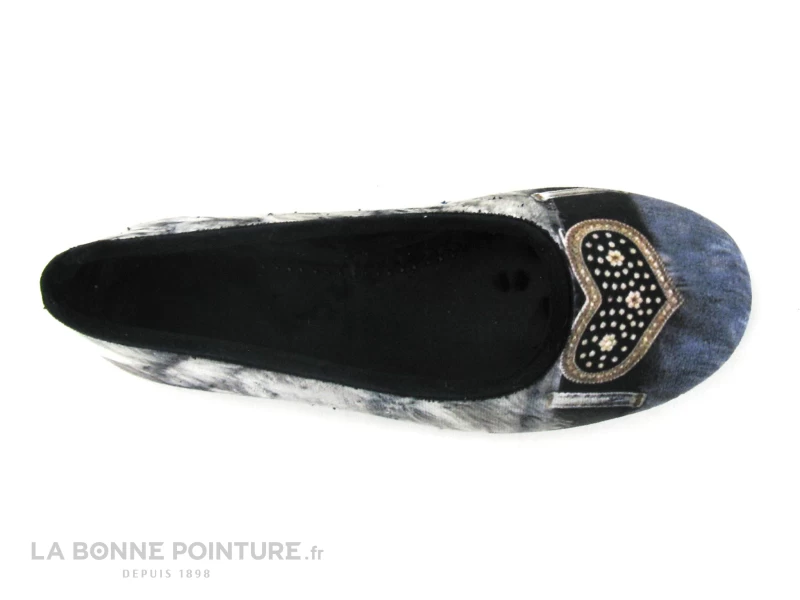 Cette ballerine d’intérieur est en textile velouté aux tons de bleu et de gris, avec un liseré noir sur le pourtour.