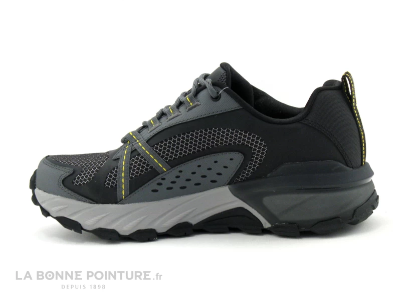 Cette chaussure de rando Homme Skechers est noire et grise, avec un peu de jaune.