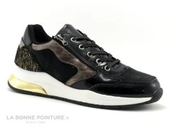 Ces sneakers Femme sont noires et bronze/Or, avec des parties vernies et métallisées.
