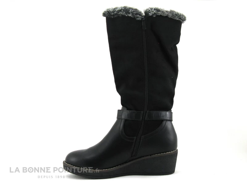 Cette botte à semelle compensée mélange simili cuir noir et textile velouté.