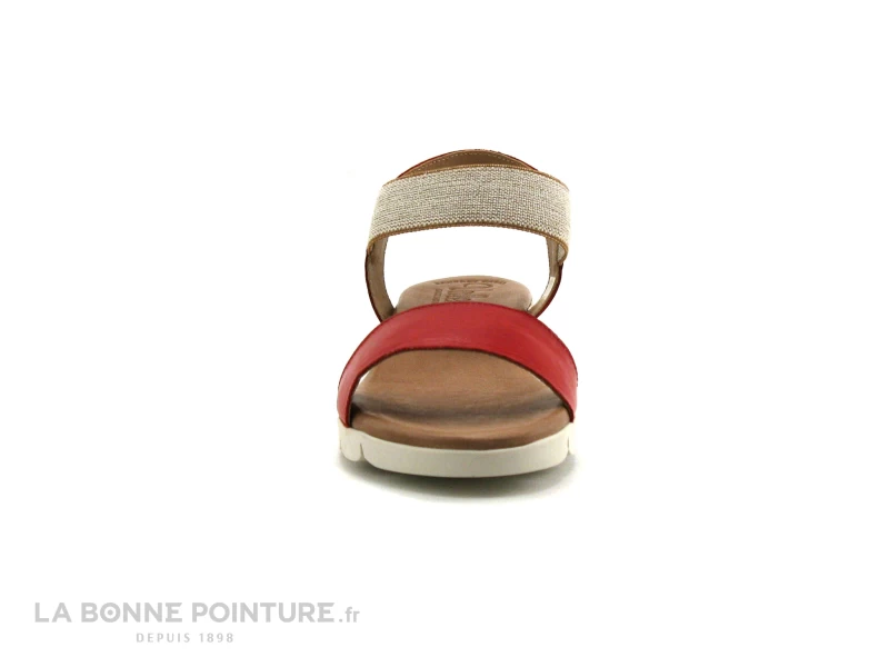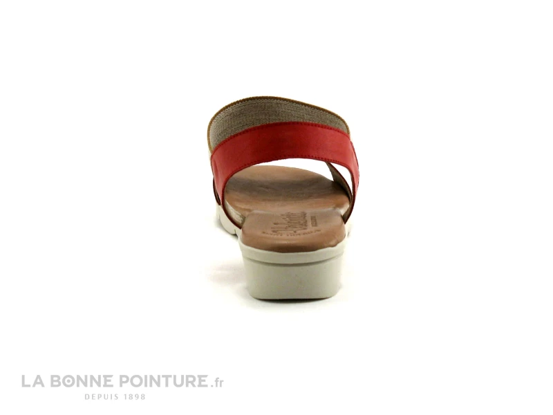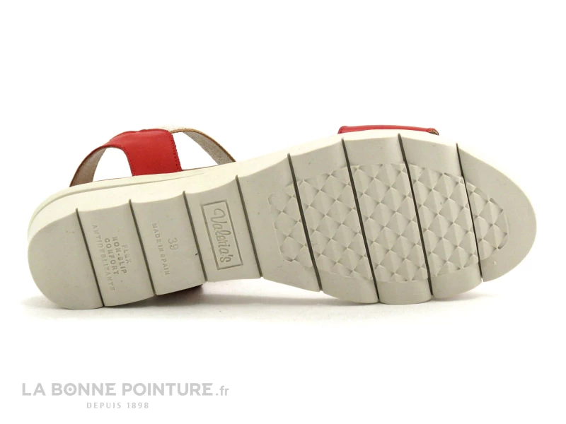 Voici de jolis nu-pieds en cuir rouge Valeria’s 5070, avec une bride beige élastiquée qui permet d’enfiler facilement la chaussure.