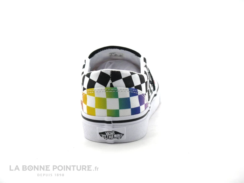 Cette basket Vans sans lacet mélange une toile à damier noire et blanche et multicolore.