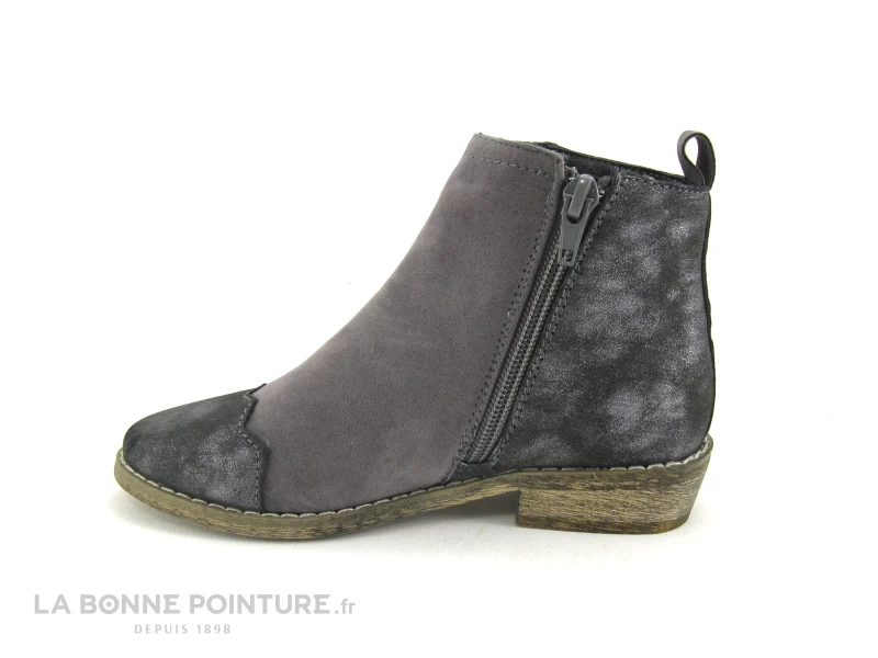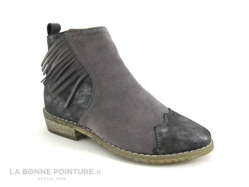 Cette chaussure enfant est en simili cuir gris velouté, avec la pointe et l’arrière des boots gris métal.